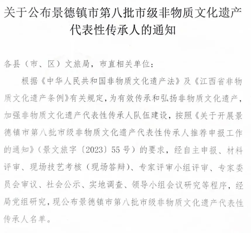 经自主申报、材料评审、现场技艺考核(现场答辩)、专家评审小组评审、专家委员会审议、社会公示、实地调查、领导小组会议研究等程序,8月2日,景德镇市文旅局正式公布景德镇市第八批市级非物质文化遗产代表性传承人的评选结果,具体名单见文后附件,以下是通知原文: